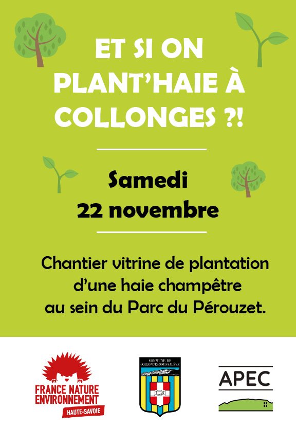 Samedi 22 novembre, France Nature Environnement Haute-Savoie, la commune de Collonges et l'APEC (Association pour la Protection de l'Environnement Collongeois) vous convient Ă un chantier vitrine de plantation d'une haie champĂȘtre au sein du Parc du PĂ©rouzet.Â