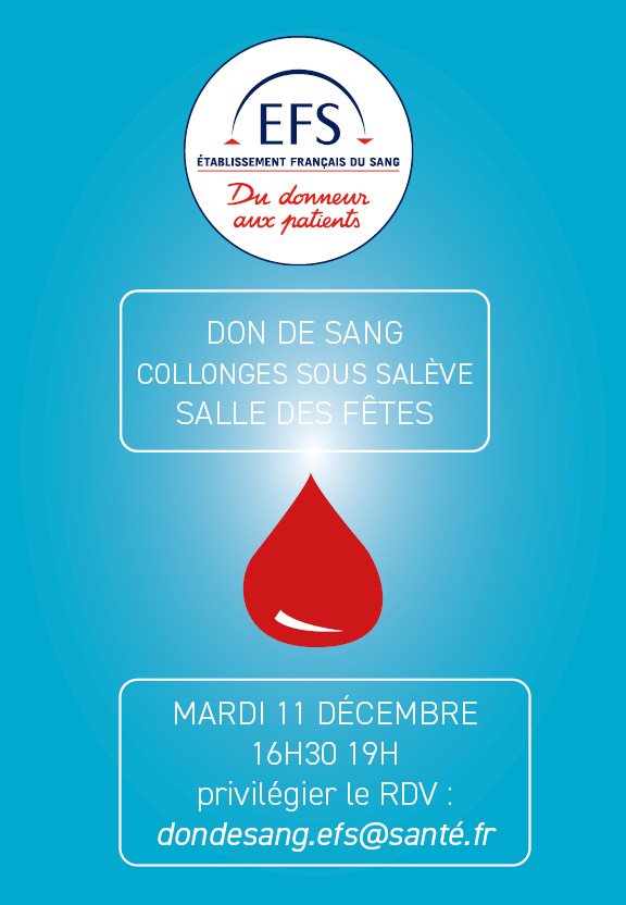 La collecte de sang sera suivi de l'Assemblée générale de l'association à 19h30.